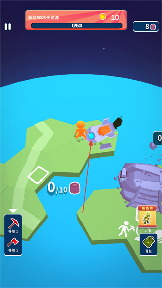 4、當完成星球上的資源收集后,按新任務(wù)提示,比如獲取50木頭資源,前往新的島嶼,繼續(xù)收集資源。