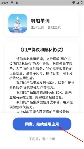 1、在用戶協(xié)議和隱私協(xié)議頁面,點(diǎn)擊同意,繼續(xù)使用應(yīng)用,進(jìn)入主界面。