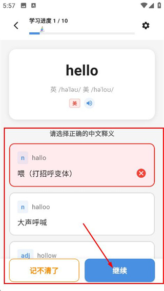 3、在單詞學(xué)習(xí)頁面,選擇正確的中文釋義后,點(diǎn)擊繼續(xù),查看單詞詳細(xì)內(nèi)容。