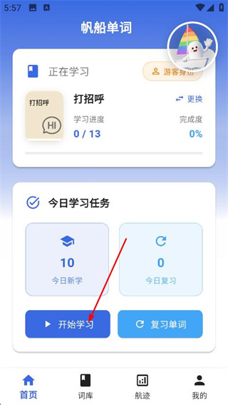 2、在帆船單詞主界面,點(diǎn)擊開始學(xué)習(xí),進(jìn)入單詞學(xué)習(xí)頁面。