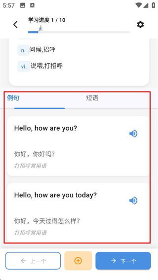 4、在單詞詳細(xì)內(nèi)容頁面,可查看單詞的例句等信息,還能點(diǎn)擊下一個(gè)學(xué)習(xí)下一個(gè)單詞。