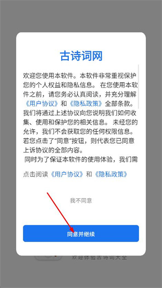 1、在古詩詞網(wǎng)協(xié)議彈窗中,點擊同意并繼續(xù),進入首頁。