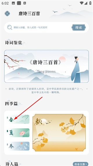 3、在唐詩三百首頁面,點擊春,進入春季唐詩頁面。