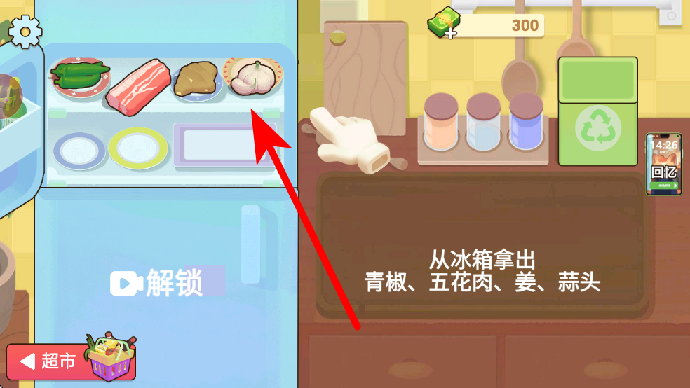 2、進(jìn)入游戲后,先從冰箱中選取需要的食材,比如青椒、五花肉、姜、蒜頭這些,為后續(xù)的烹飪步驟做好準(zhǔn)備。
