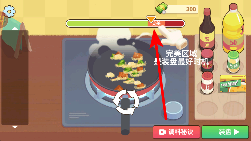 4、切好食材后開始烹飪,在烹飪過程中,要留意上方的進(jìn)度條,當(dāng)指針到達(dá)完美區(qū)域時(shí),是裝盤的最好時(shí)機(jī),此時(shí)裝盤能獲得更好的效果。