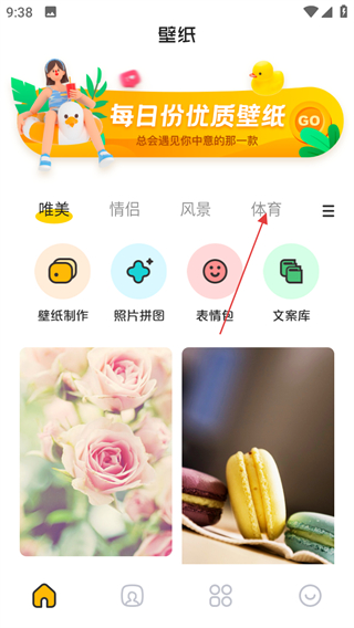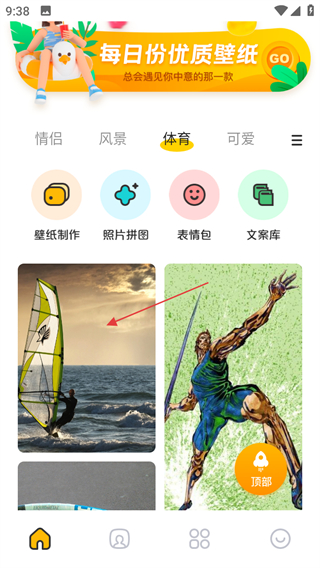 1、在壁紙頁(yè)面,點(diǎn)擊體育標(biāo)簽,切換到體育類壁紙。