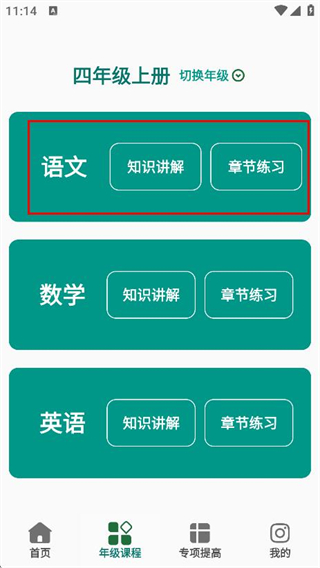 2、在年級(jí)課程頁(yè)面,點(diǎn)擊學(xué)科知識(shí)講解,進(jìn)入語(yǔ)文知識(shí)講解單元列表頁(yè)面。