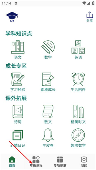 1、在小學(xué)樂(lè)學(xué)助手的首頁(yè),點(diǎn)擊底部的年級(jí)課程,進(jìn)入年級(jí)課程頁(yè)面。