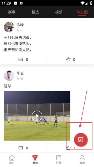 3、在球友圈頁面,點(diǎn)擊右下角的紅色編輯圖標(biāo),準(zhǔn)備發(fā)帖。