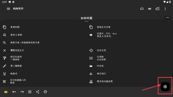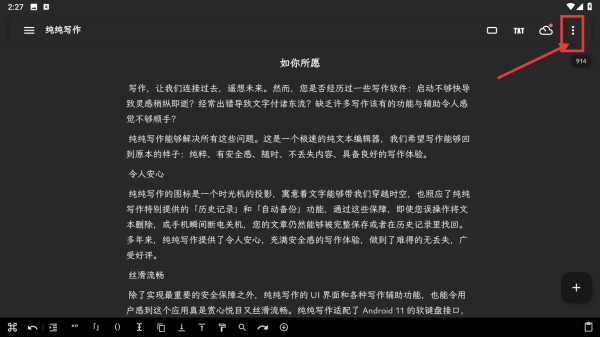 1、打開純純寫作應(yīng)用,點擊右上角三點菜單按鈕,展開功能菜單。