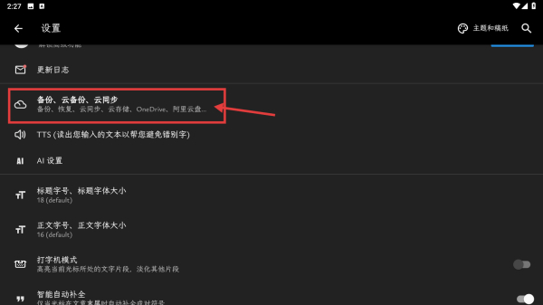 3、在設(shè)置頁面,點擊備份、云備份、云同步選項,進(jìn)入備份同步設(shè)置頁面。