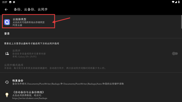 4、在備份同步設(shè)置頁面,點擊云選擇類型選項,可選擇并配置云存儲類型進(jìn)行備份同步操作。