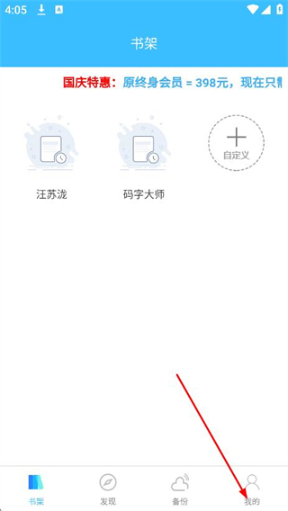 1、在書架頁面,點(diǎn)擊底部我的,進(jìn)入我的頁面。