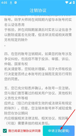 4、在注銷協(xié)議頁面,點(diǎn)擊申請注銷與謹(jǐn)慎,可申請注銷賬號。