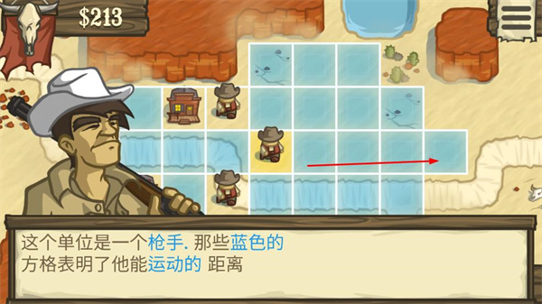 2、操控槍手等單位,藍色方格代表單位能運動的距離,可根據(jù)方格范圍移動單位,部署在合適位置。