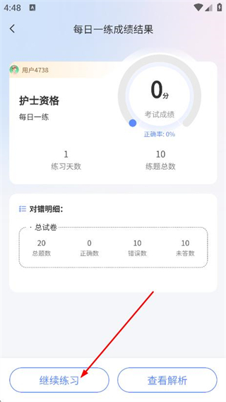 4、在每日一練成績結果頁面,點擊繼續(xù)練習,可繼續(xù)進行練習。
