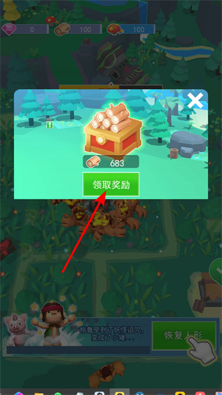 1、點(diǎn)擊領(lǐng)取獎(jiǎng)勵(lì),獲取木材資源,這是游戲中重要的建設(shè)資源,用于升級(jí)建筑和解鎖功能。