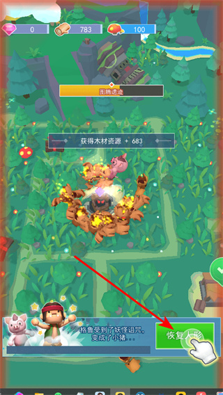 2、點(diǎn)擊恢復(fù)人形,解除角色的小豬形態(tài),恢復(fù)了正常的狀態(tài)以繼續(xù)執(zhí)行任務(wù)和探索的場(chǎng)景。