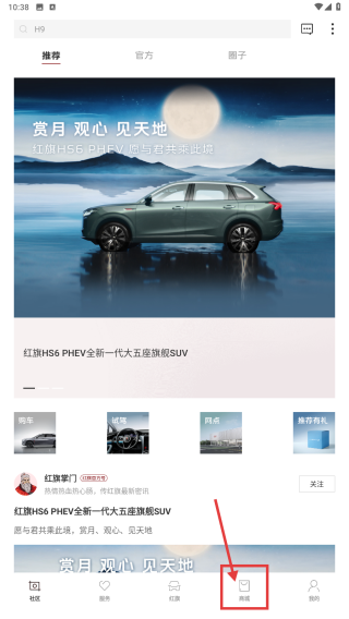 1、打開紅旗汽車應用,點擊底部商城選項,進入商城頁面。