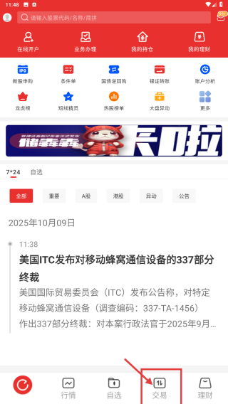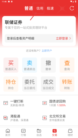1、打開聯(lián)儲(chǔ)證券應(yīng)用,點(diǎn)擊底部交易選項(xiàng),進(jìn)入交易頁面。