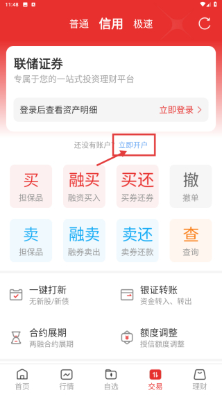 3、在信用交易頁面,點(diǎn)擊立即開戶選項(xiàng),進(jìn)入自助開戶頁面。