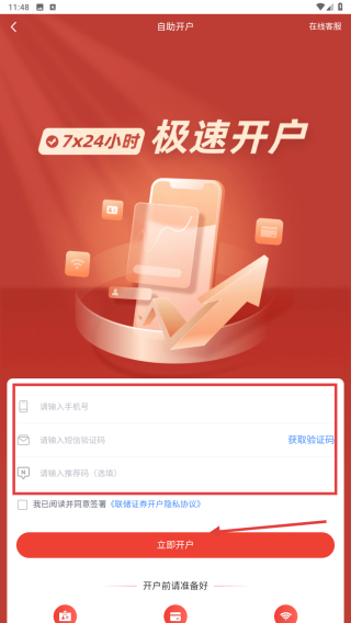 4、在自助開戶頁面,依次輸入手機(jī)號(hào)碼、驗(yàn)證碼、推薦碼點(diǎn)擊立即開戶按鈕,完成證券賬戶開戶操作。
