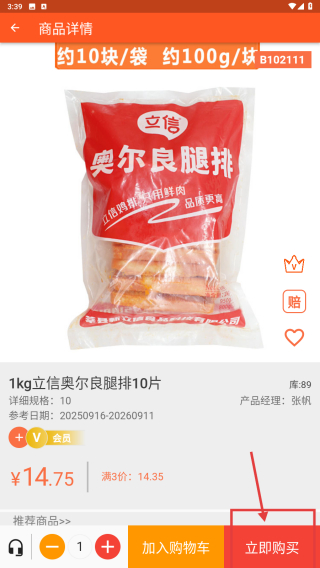 3、在商品列表中,找到1kg立信奧爾良腿排10片條目,點擊進(jìn)入商品詳情頁。