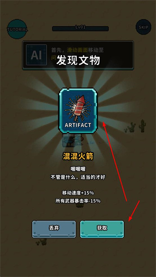 2、在探索過程中,會發(fā)現(xiàn)文物,可選擇獲取,文物能帶來屬性加成,像混混火箭可提升15%移動速度和15%所有武器暴擊率。