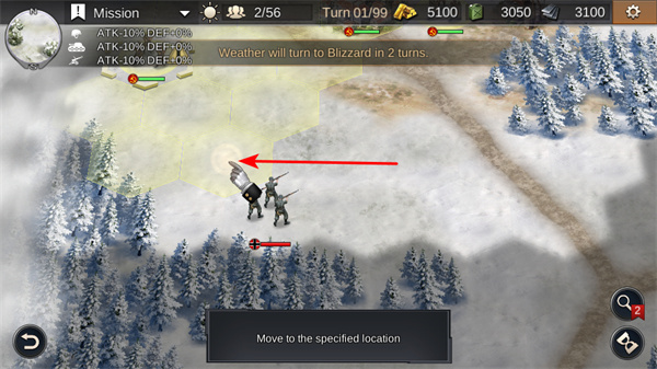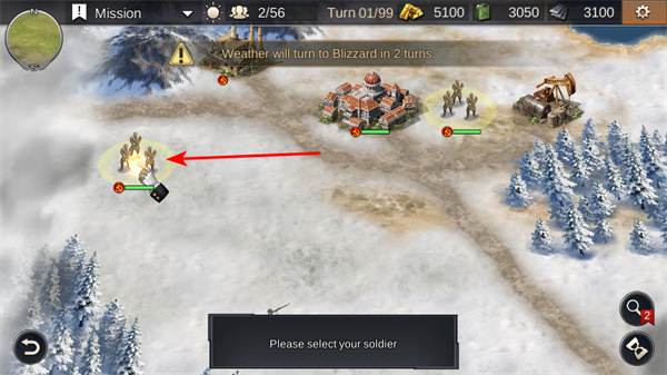 2、移動對應(yīng)士兵,將選中的士兵移動到指定位置,規(guī)劃移動路徑以搶占戰(zhàn)略點或接近敵人,提升戰(zhàn)斗優(yōu)勢。
