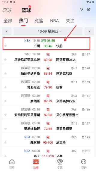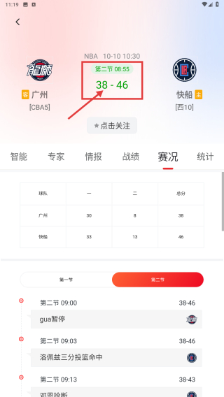 3、在籃球賽事板塊,找到廣州VS快船的NBA賽事條目第二節(jié)08:55,比分為38-46,點擊進入賽況詳情頁。