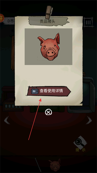 4、點(diǎn)擊查看貢品豬頭道具,選擇查看使用詳情,依據(jù)提示將道具用在合適地方推進(jìn)劇情。