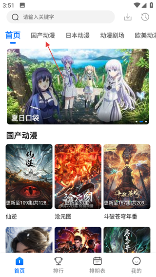 1、進(jìn)入軟件首頁,點(diǎn)擊頂部國產(chǎn)動漫標(biāo)簽,進(jìn)入國產(chǎn)動漫分類頁面。