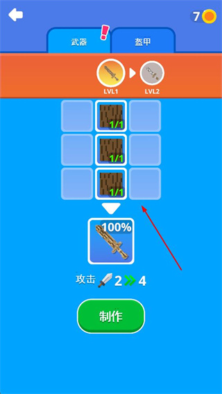 3、進入武器制作界面,可查看制作武器所需的材料,當材料集齊時,點擊制作按鈕,能制作出攻擊力更強的武器。