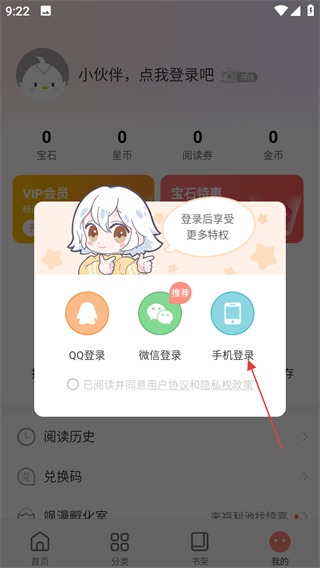 3、在登錄引導(dǎo)界面,選擇手機(jī)登錄,進(jìn)入手機(jī)登錄頁面。