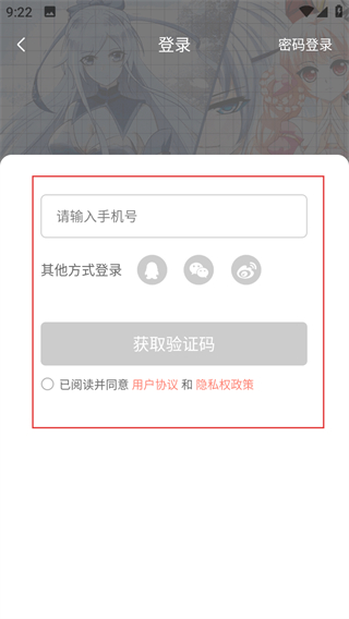 4、在手機(jī)登錄頁面,輸入信息勾選協(xié)議后,完成登錄操作。