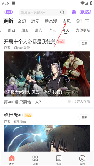 1、進入軟件首頁,點擊頂部古風標簽,進入古風漫畫分類頁面。