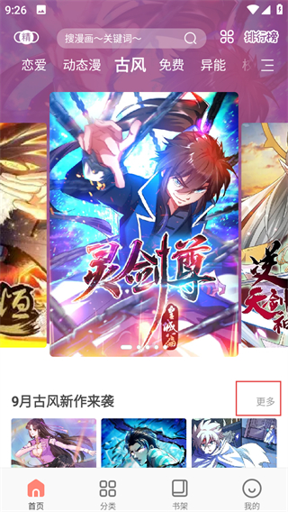 2、在古風漫畫分類頁面,點擊更多,進入古風新作列表頁面。
