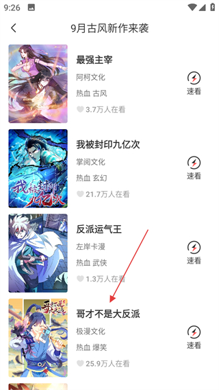 3、在古風新作列表頁面,找到哥才不是大反派,點擊進入其詳情頁面。