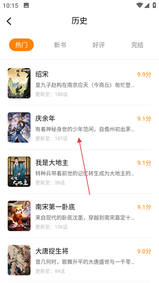 3、在歷史類漫畫列表頁面,找到慶余年,點擊進入其詳情頁面。