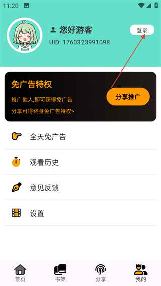 2、在輕漫島的個(gè)人頁(yè)面,點(diǎn)擊登錄,進(jìn)入登錄賬號(hào)頁(yè)面。