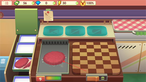 1、查看界面上方資源數(shù)值,點(diǎn)擊食材欄取牛肉餅,放烤架上烹飪。