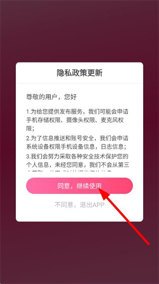 1、在隱私政策更新彈窗中,點擊同意,繼續(xù)使用,進(jìn)入軟件。