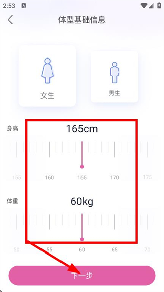 4、在體型基礎(chǔ)信息填寫頁面,選擇性別、設(shè)置身高和體重后,點擊下一步,繼續(xù)體型檢測流程。