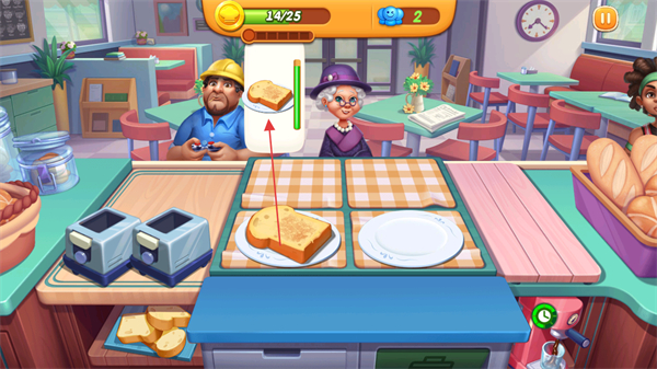 4、將做好的餐點(diǎn)交付給顧客,獲取金幣,提升金幣數(shù)量,避免顧客情緒值降低,完成金幣目標(biāo)通關(guān)。