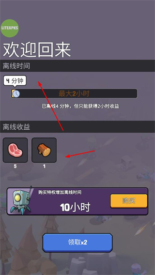 1、支持離線收益,離線后可獲得肉類、木材等資源,離線時間最長可獲得2小時收益,也可購買特權(quán)增加離線時間。