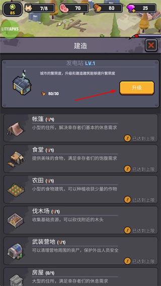 2、在建造界面,可升級發(fā)電站等建筑,提升城市繁榮度,還可建造帳篷、食堂、農(nóng)田、伐木場、武裝營地、房屋等設(shè)施。