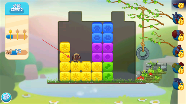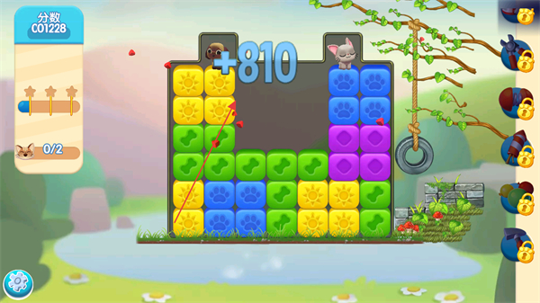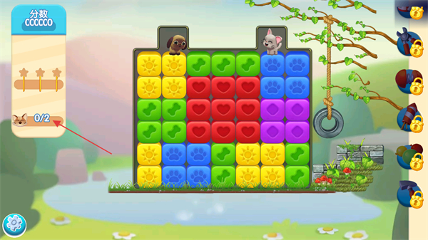 2、留意屏幕左側(cè)顯示的需要營救的寵物數(shù)量如0/2,通過點擊或滑動,讓3個及以上相同顏色的方塊相連進(jìn)行消除。