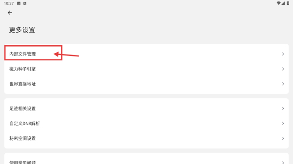 3、在更多設(shè)置頁(yè)面,點(diǎn)擊內(nèi)部文件管理選項(xiàng),進(jìn)入文件管理界面。