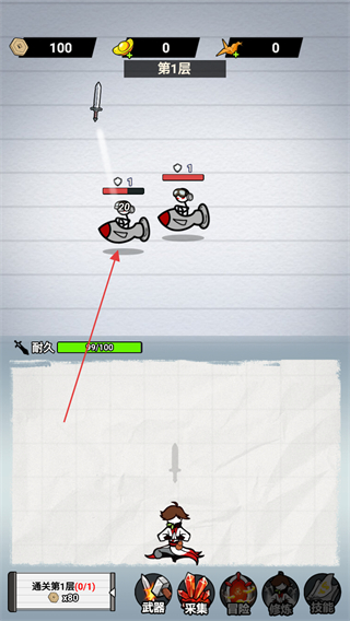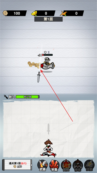 1、進(jìn)入游戲,看到屏幕上方顯示第1層,操控角色出劍攻擊敵人,擊敗敵人獲取金幣。