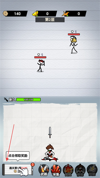 4、進(jìn)入第2層,點(diǎn)擊左下角點(diǎn)擊領(lǐng)取獎(jiǎng)勵(lì),獲取獎(jiǎng)勵(lì)提升實(shí)力。